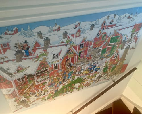 Puzzel van 5000 stukjesopgehangen in het trapgat.