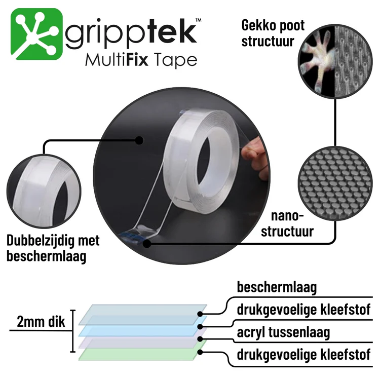 GrippTek MultiFix Tape Original 2.0 maakt gebruik van uniek nano-structuur technologie dat de zelfde structuur imiteert als dat van een echte gekko. Hierdoor zijn geen schadelijke en chemische stoffen nodig voor een krachtige kleefkracht, en is de tape gemakkelijk verwijderbaar én herbruikbaar!