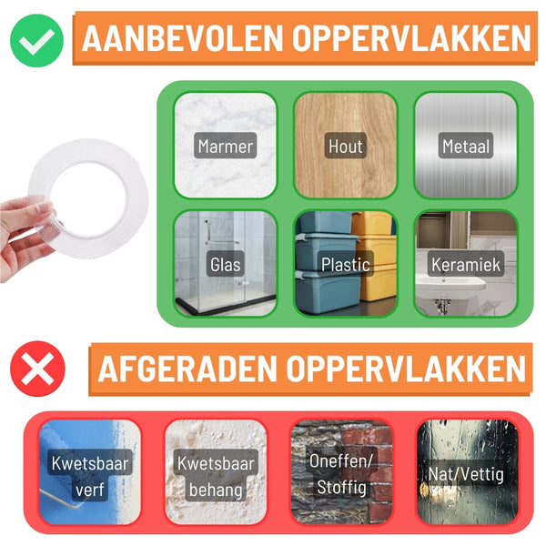 💬 Voor optimale kleefkracht zorg er altijd voor dat het oppervlak schoon, droog, stofvrij en vetvrij is. Je kunt eventueel het oppervlak schoon maken met wat alcohol indien toepasbaar. Bij het bevestigen van objecten zorg er altijd voor dat je de tape zo min mogelijk aanraakt met de vingers, dit vermindert de kleefkracht. Druk eerst de tape goed aan en verwijder daarna pas de beschermlaag.